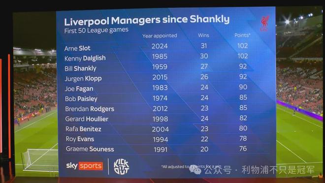 图片显示,在利物浦队史自香克利至今,尽管最近7轮输了6场,但斯洛特至今为止的前50场联赛战绩,依然与达格利什并列队史第一(102分),而胜场独居第一(31场)。