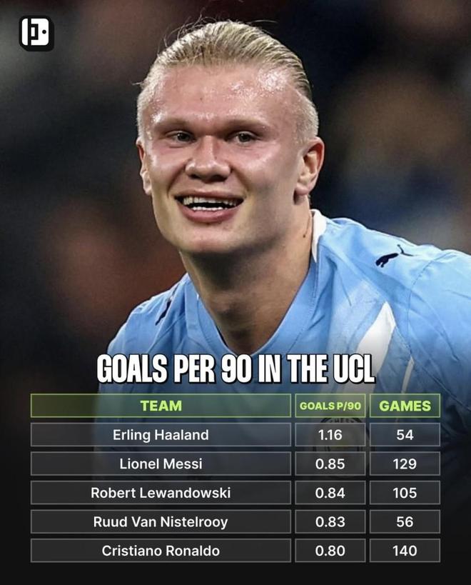 欧冠改制之后,强队在联赛阶段要多踢比赛,通常一个赛季欧冠可以达到12场甚至更多。以哈兰德目前的地位和曼城这种级别的球队平台,只要保持健康,每季稳定出场10–12场欧冠是常态。就算把效率从现在的1.16,压到和梅西、莱万、C罗接近的0.8球/场,再踢80–100场欧冠,新增进球也会落在60–80球的区间。叠加现有的欧冠进球,生涯总进球自然会冲向120球以上的级别。